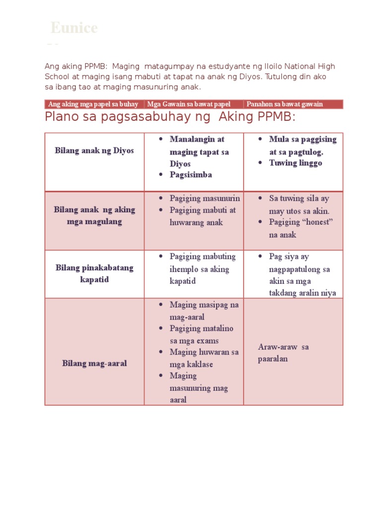 Halimbawa sa PPMB ni Faustina. Batay sa ginawa mong PPMB sa Gawain 1 tukuyin ang mga dapat mong gawin upang matupad mo ang iyong misyon na nakalahad sa iyong PPMB sa ibat ibang papel na ginagampanan mo sa buhay halimbawa bilang anak kapatid kamag-aral kabataan.