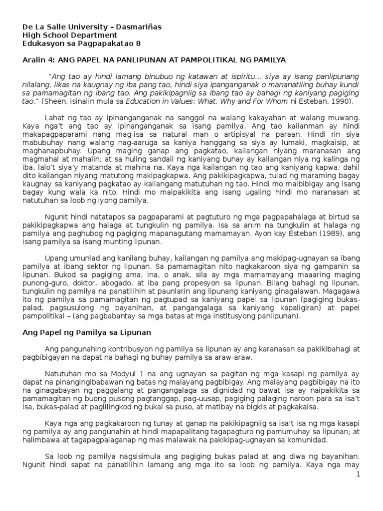 Aralin 4 Ang Papel Na Panlipunan At Pampolitikal Ng Pamilya Pdf
