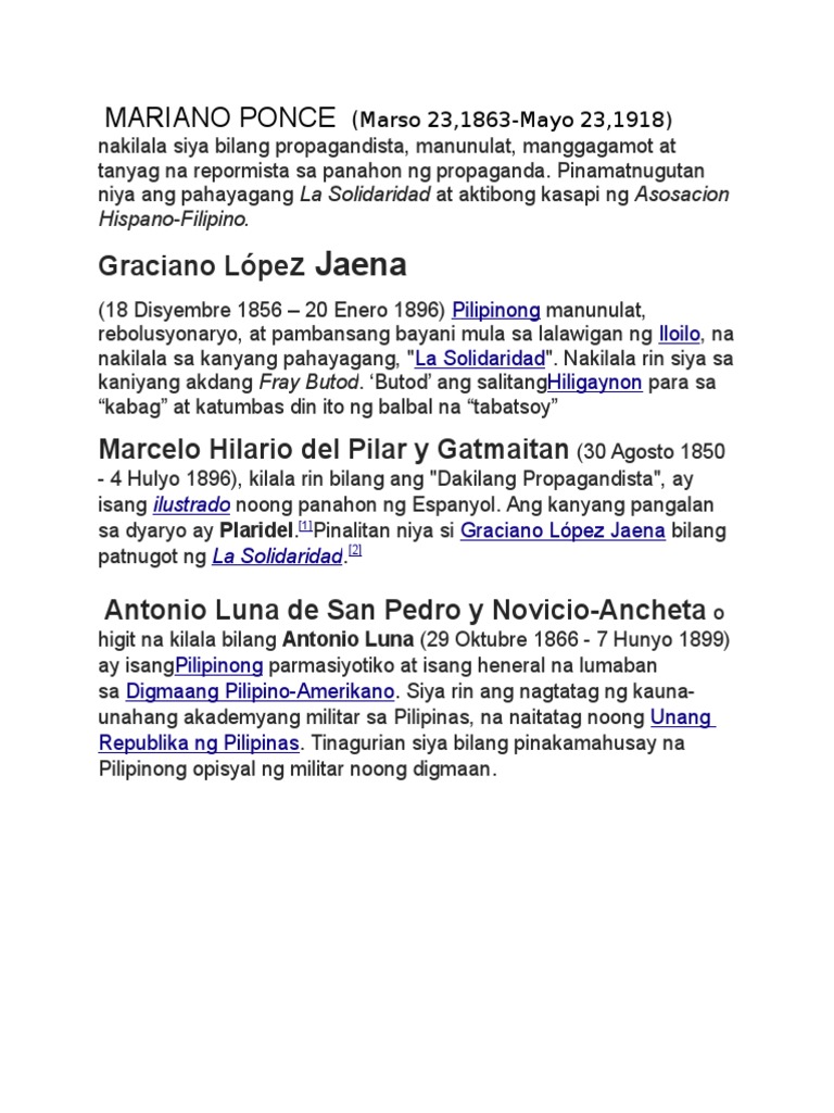 In Spain he was among the founders of La Solidaridad and Asociación Hispano-Filipino. Si Mariano Ponce Marso 23 1863-Mayo 23 1918 ay isang Pilipinong manggagamot na naging pinuno ng Kilusang Propaganda. Si Antonio Luna ay.