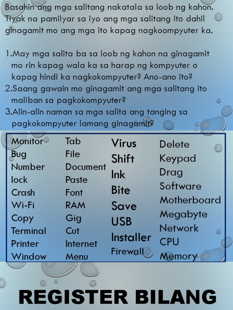 REGISTER Bilang Barayti ng Wika Minsan sinusulat na rejister ito ito ay barayti ng wikang espisyalisadong ginagamit ng isang partikular na domeyn. Register bilang varayti ng wika by yleno_me. Mga salitang pangkompyuter lamang Mga salitang hindi lamang pangkompyuter KAPITAL drag software motherboard megabytre network Ang text sa cell phone ay tumutukoy sa.